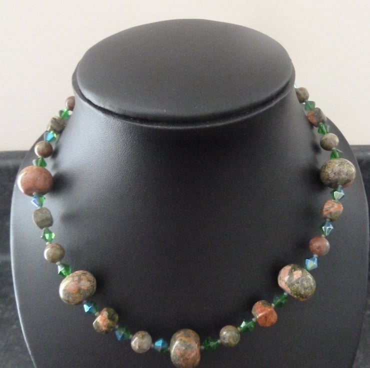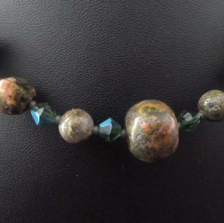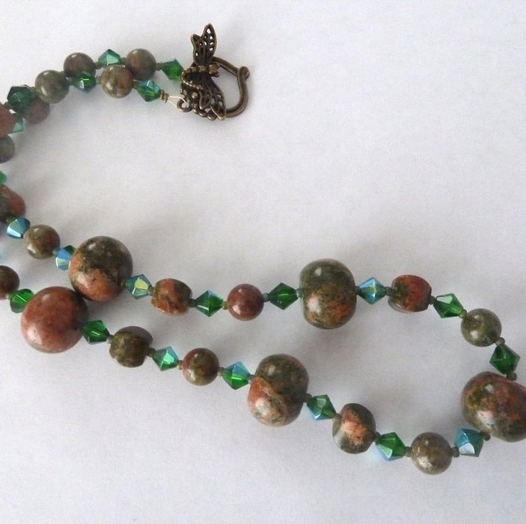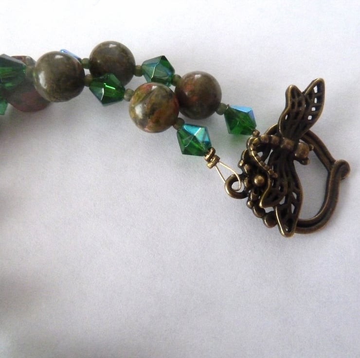A handmade necklace which i have made using unakite gemstone beads with green glass beads, it fastens with a bronze plated dragonfly toggle.