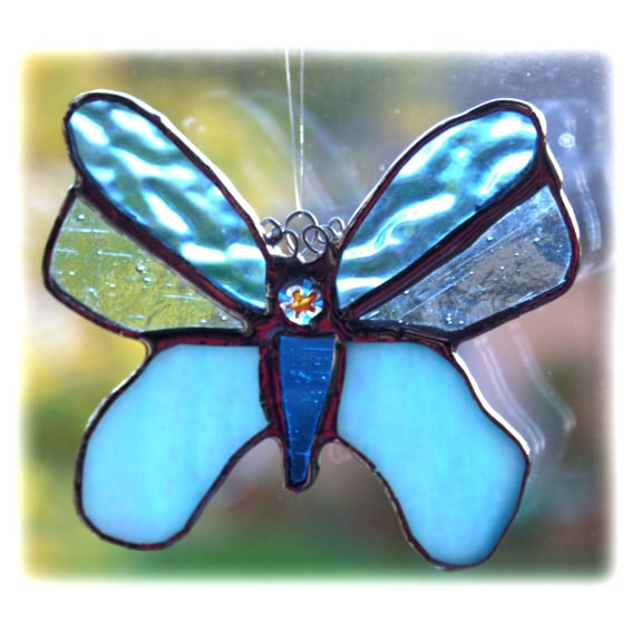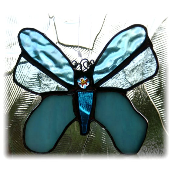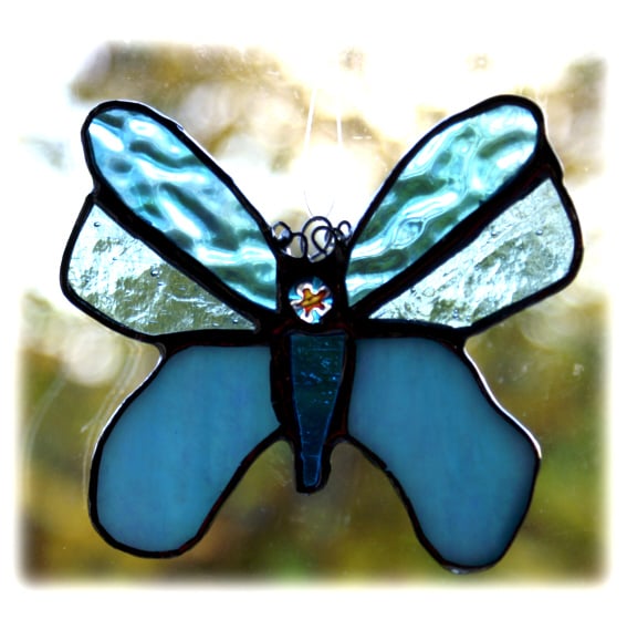 It is a very pretty little butterfly made of lovely shiny shades of turquoise glass with some iridescent glasss for added shimmer.
