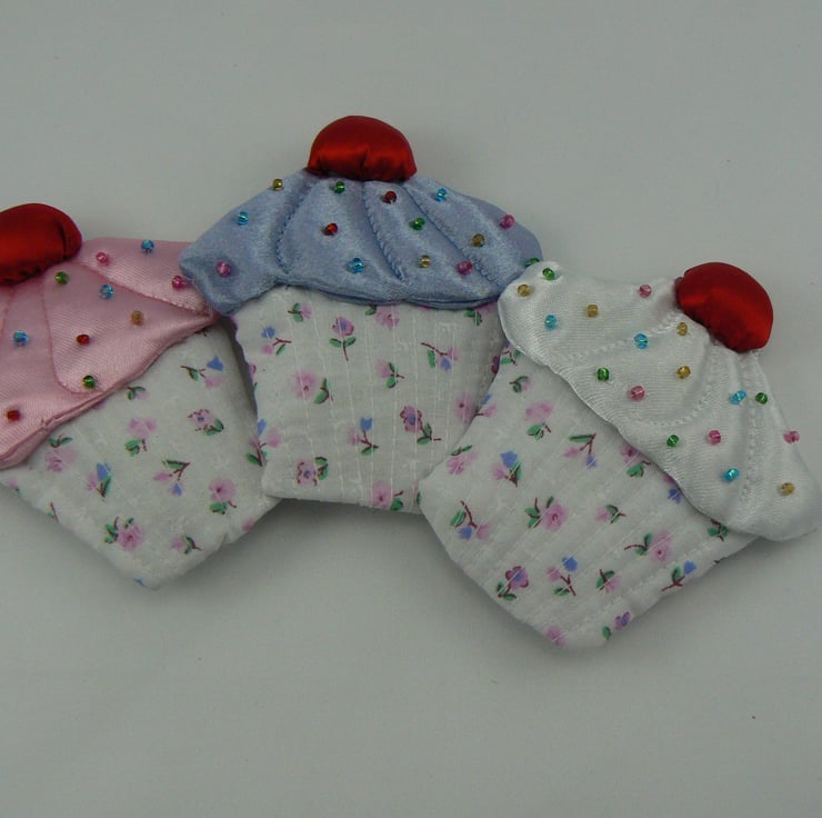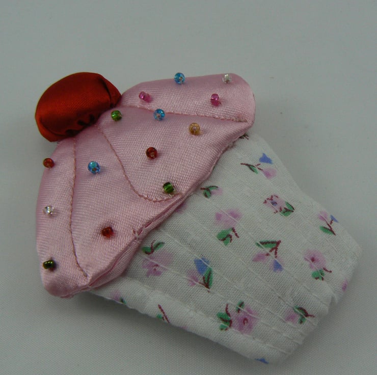 The cake case is made of cotton and the pink icing is satin (dotted with little coloured glass beads) with red satin cherry on top - yummy!