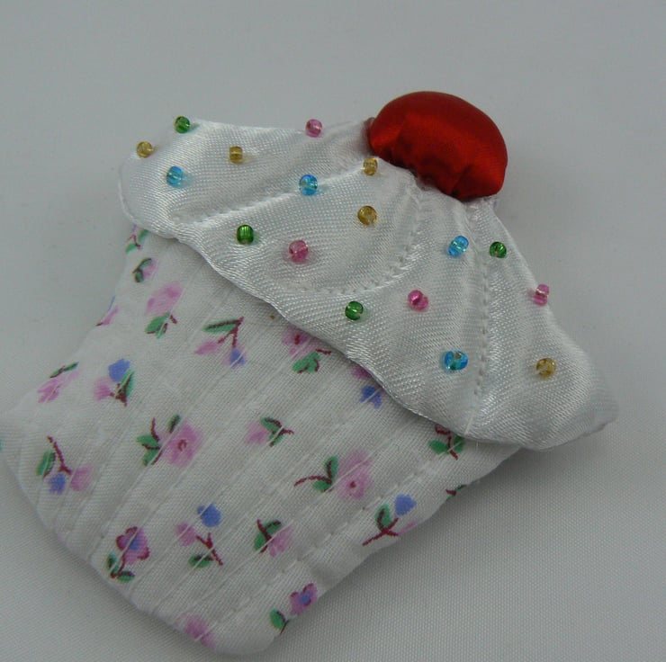 The cake case is made of cotton and the white icing is satin (dotted with little coloured glass beads) with red satin cherry on top - yummy!
