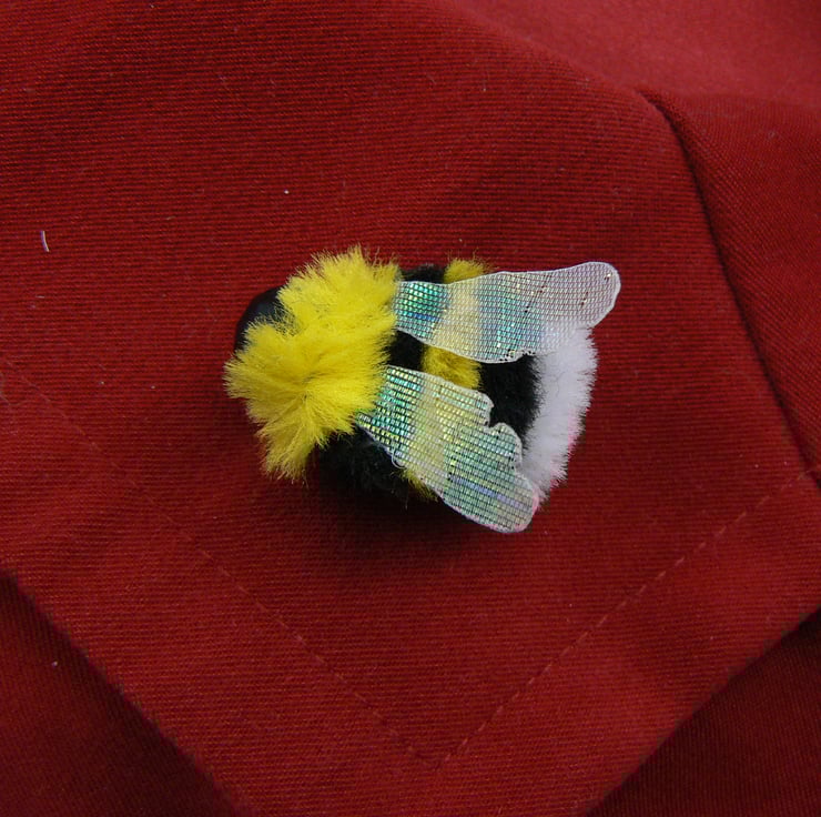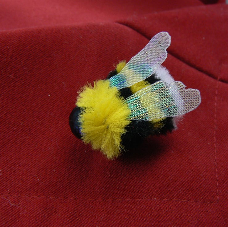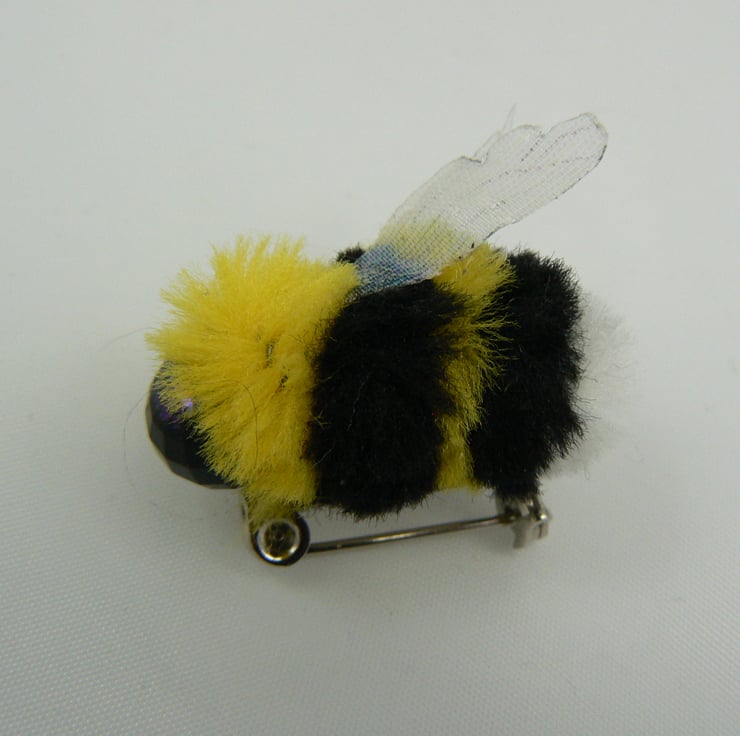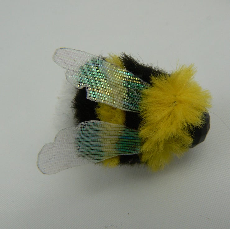 Well this is a realistic little fellow! He measures 27 x 18mm with a 20mm safety clasp pin on the back. This bumble bee is made of chenille he has a faceted black bead for his head and iridescent material for his wings.