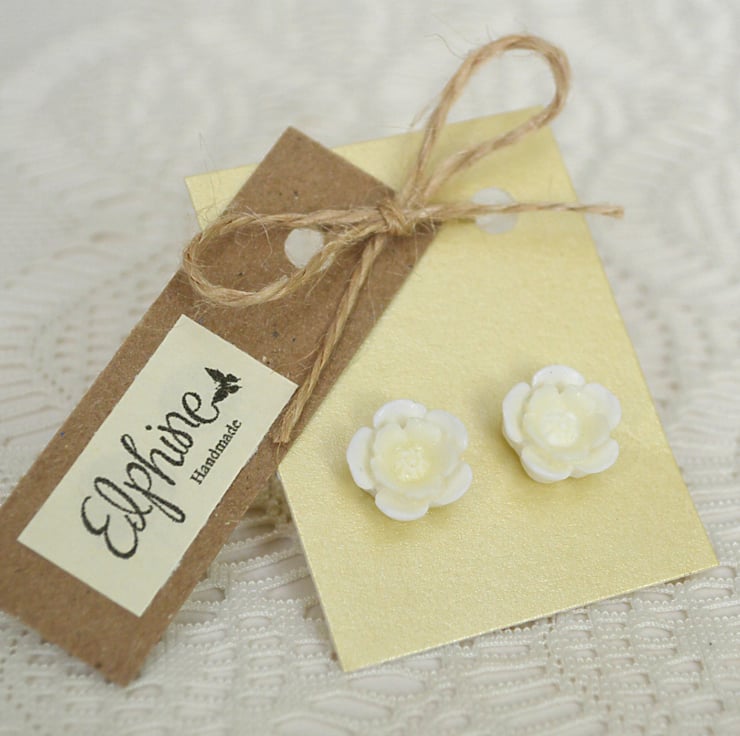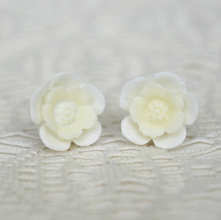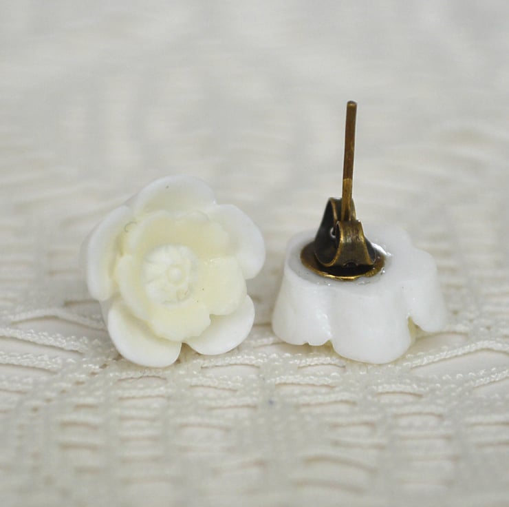 Pretty, vintage-inspired, white, resin flower earrings with antique bronze posts and butterfly backs.