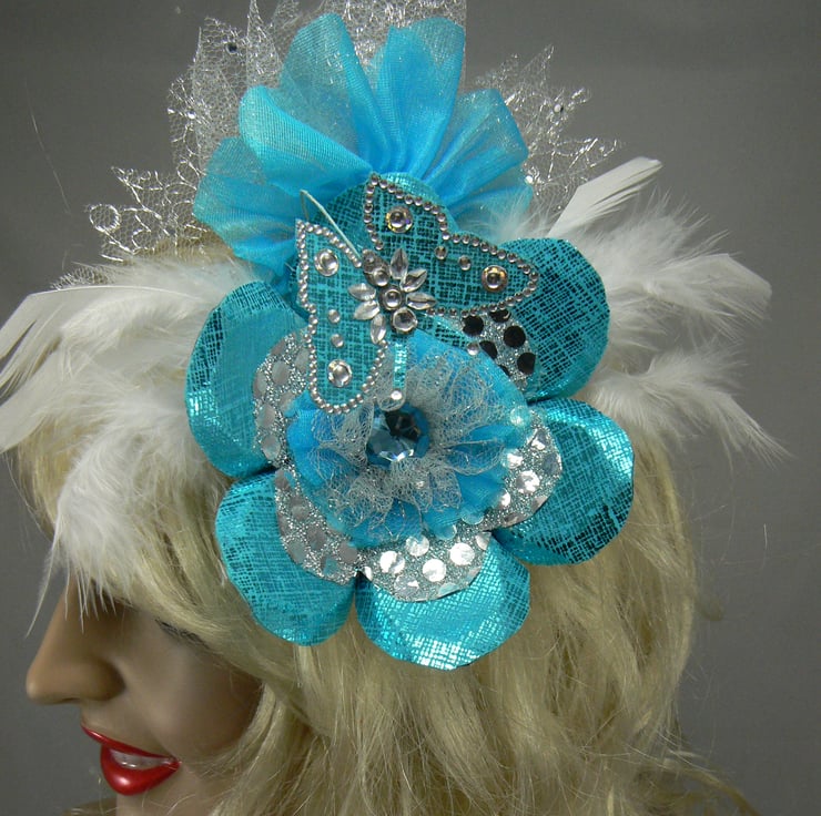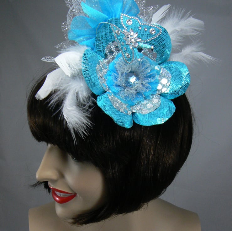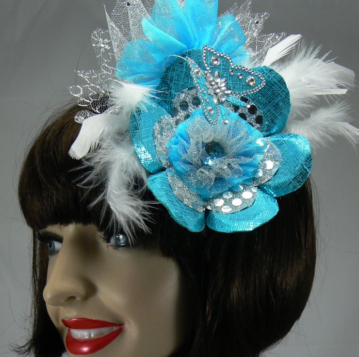 An eyecatching fascinator of a butterfly hovering over a flower. The butterfly itself is edged in rhinestones and is in the same sparkly turquoise material as the flower, which has a silver sequin lurex middle with a faceted turquoise stone in the centre. This fascinator is mounted on a 3" hair comb and measures 4 1/2" across.