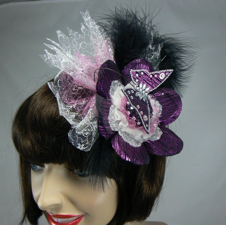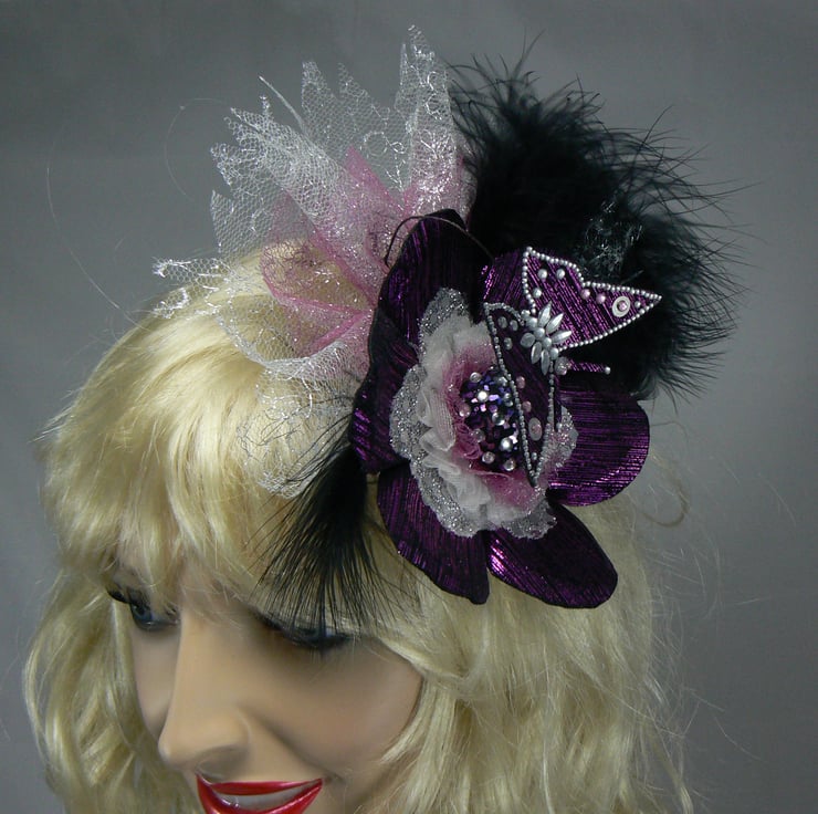 An eyecatching fascinator of a butterfly hovering over a flower in the same cerese and black sparkly material with a sequin lurex middle and gemstoned centre. The butterfly itself is edged in silver rhinestones. This fascinator is mounted on a 3" hair comb and it measures 5" across the flower.