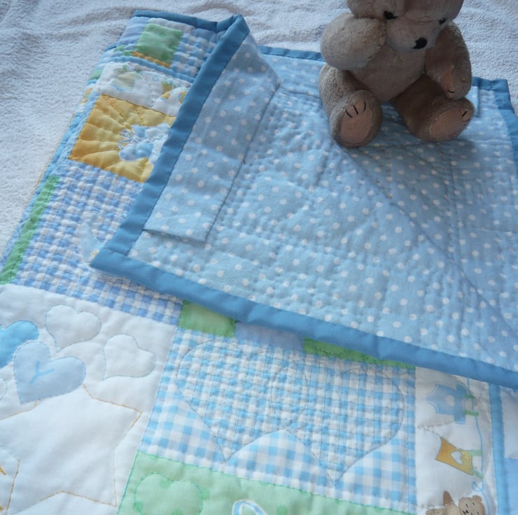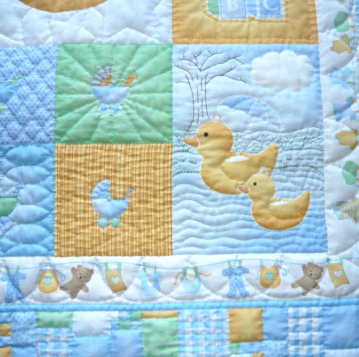 I have done a lot of hand quilting so it has a textured feel to it that baby's love to stroke as they go off to sleep.