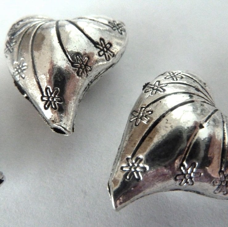 A pack of 3 heart shaped beads which have a decorative pattern on.