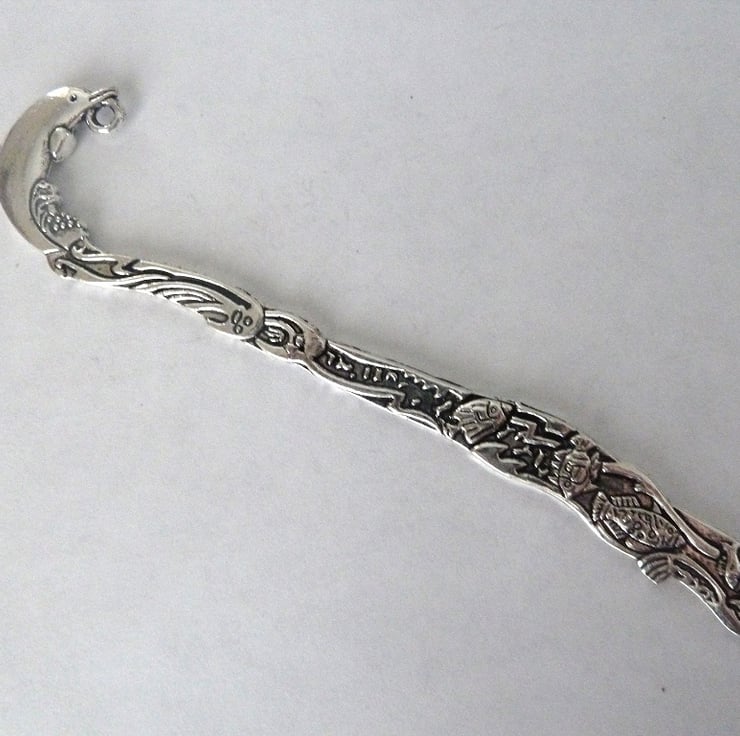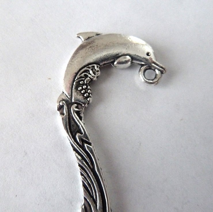 A bookmark which has been decorated with a dolphin pattern and has a hook for adding your own beads.