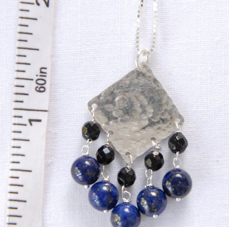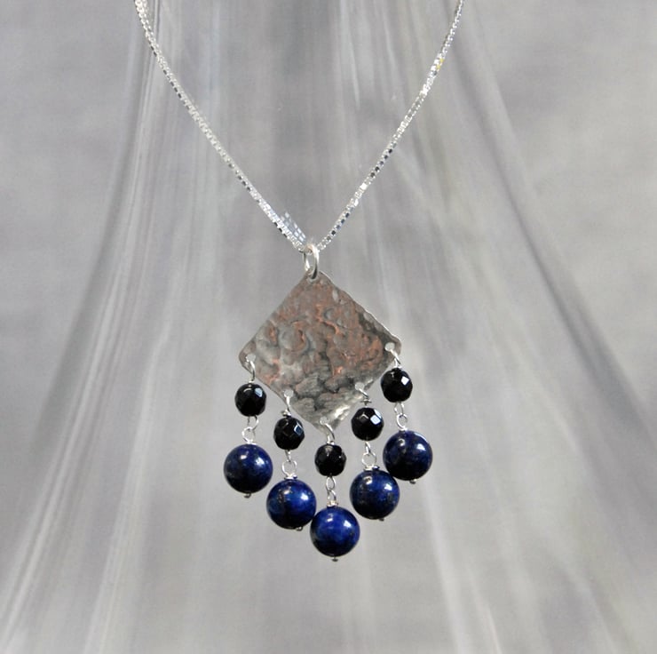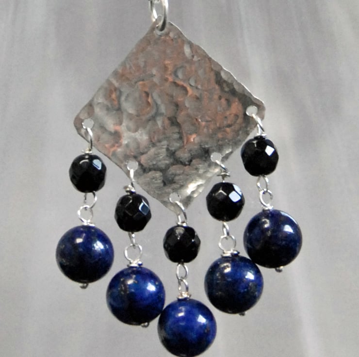 In this pendant a hammered diamond of silver is fringed with glossy black faceted onyx and royal blue lapis beads. (could be made in a different colour way if you like - drop me an email)