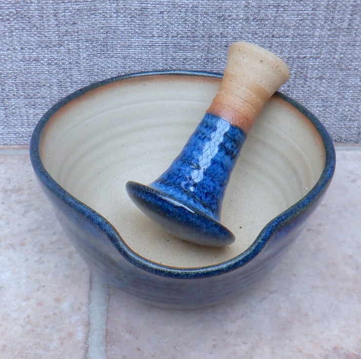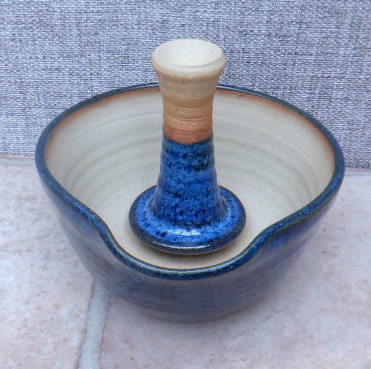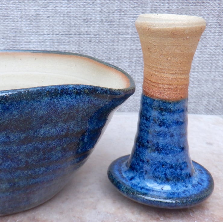 This bowl and pestle were both thrown on my pottery wheel using strong rustic stoneware clay, and I've finished them in a lovely cobalt royal blue reactive glaze.