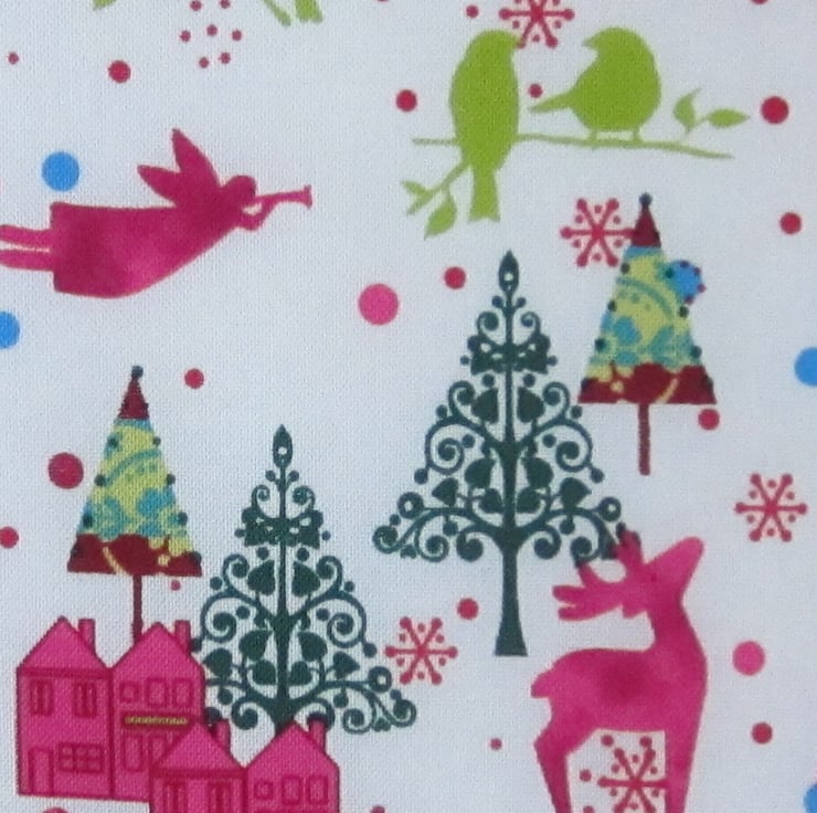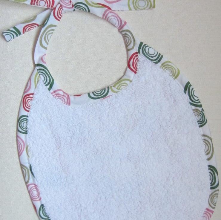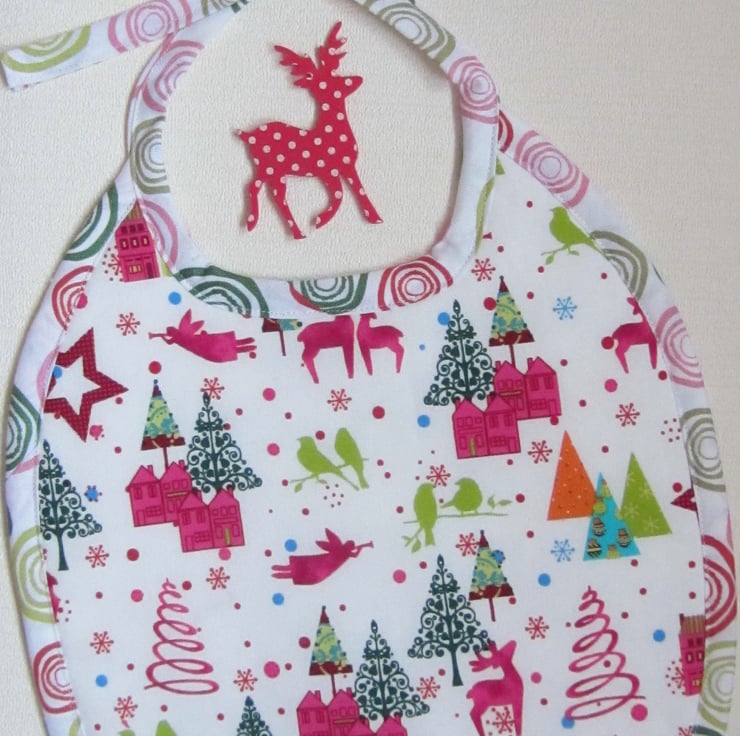 Pretty babies bib in Christmas deer and bird fabric, edged in pink, green and white swirls bias binding and backed with white towelling. This bib is suitable for babies aged about 6 to 12 months. It measures 23 cm wide and 27 cm long and ties at the neck with a bow.