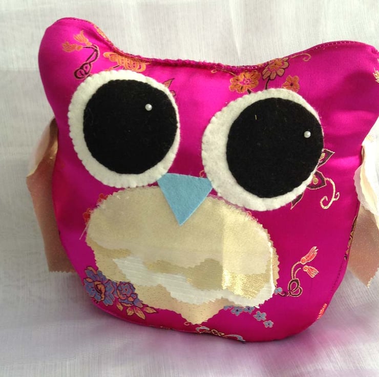 Pretty handmade decorative owl. Could be used as a small cushion or a decorative item. Owl is padded and covered with Chinese silk material, it is finished with net wings and beading. Hand wash only. 2 designs let us know which you would like.