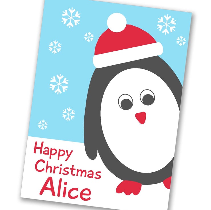 This personalised Christmas card features a cute penguin in a bobble hat!