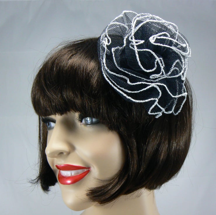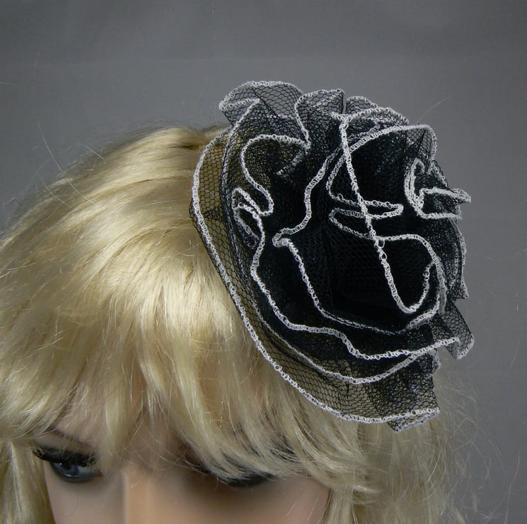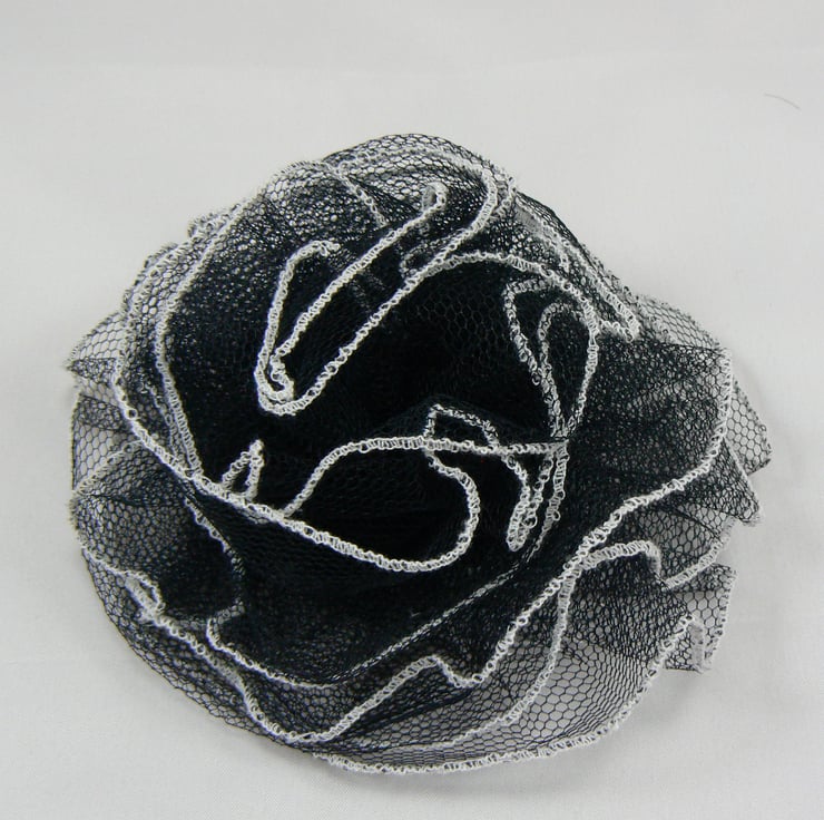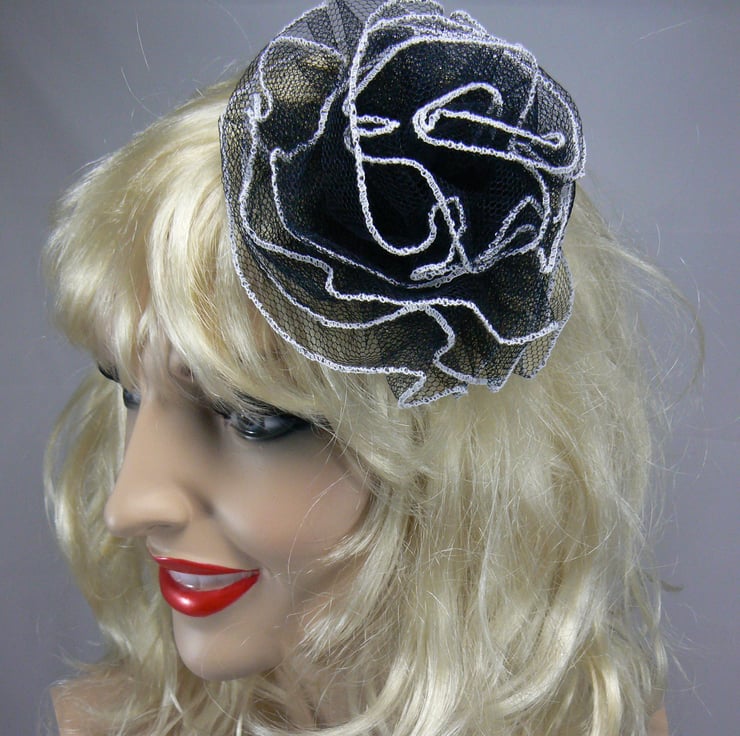 A black net hair accessory that has been edged in white and mounted on a 3" plastic hair comb.