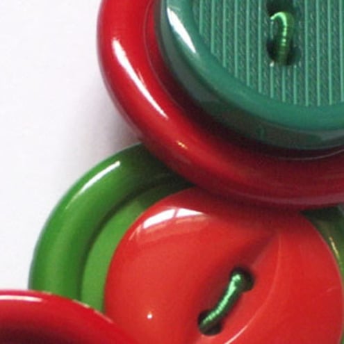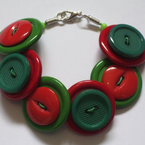 This striking button bracelet features green and red buttons. These are threaded onto jewellery wire, which secures at the end with a lobster clasp fastener.