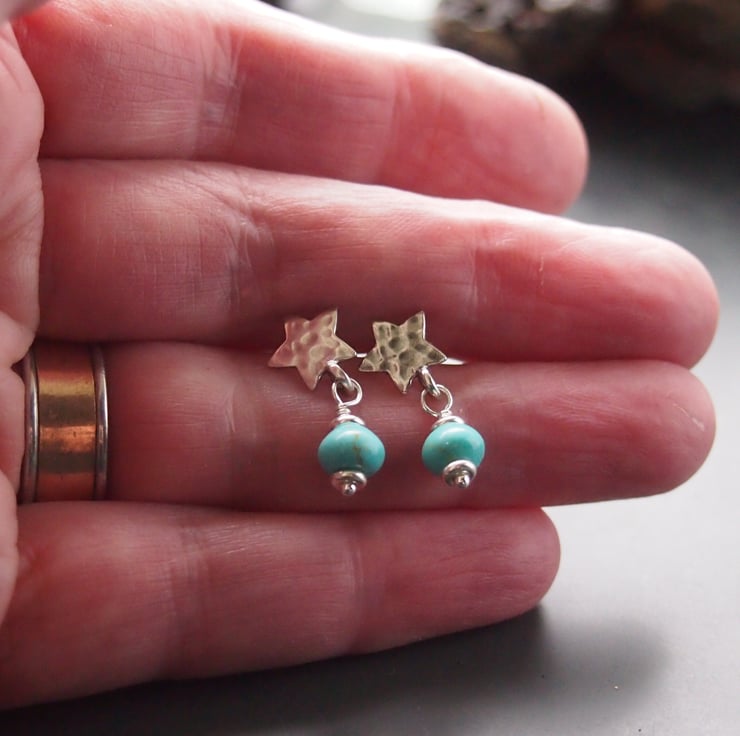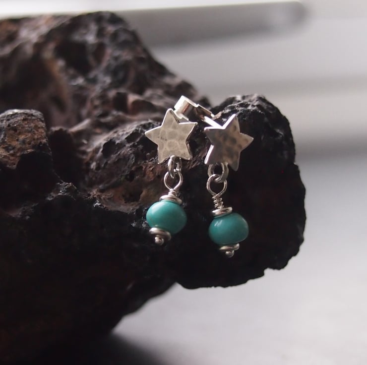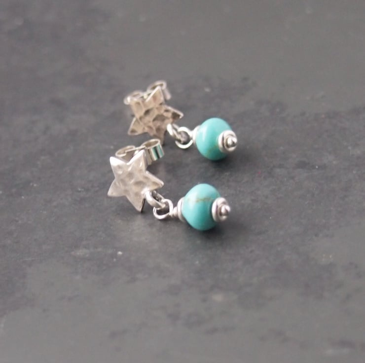 Little silver stars made from sterling silver are slightly patinated and textured. They have a smooth turquoise bead with sterling silver beads top and bottom.
