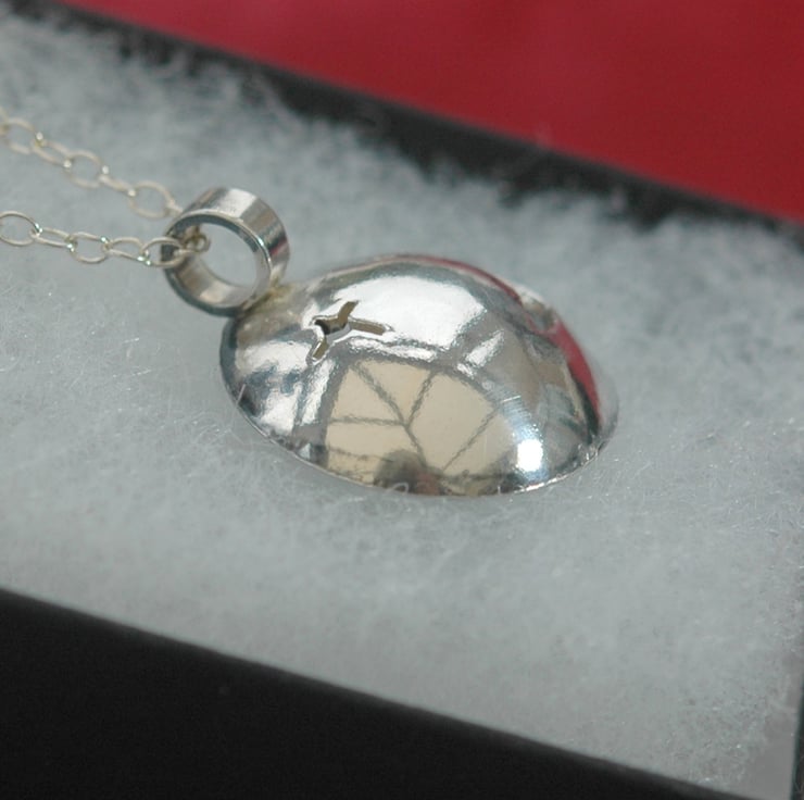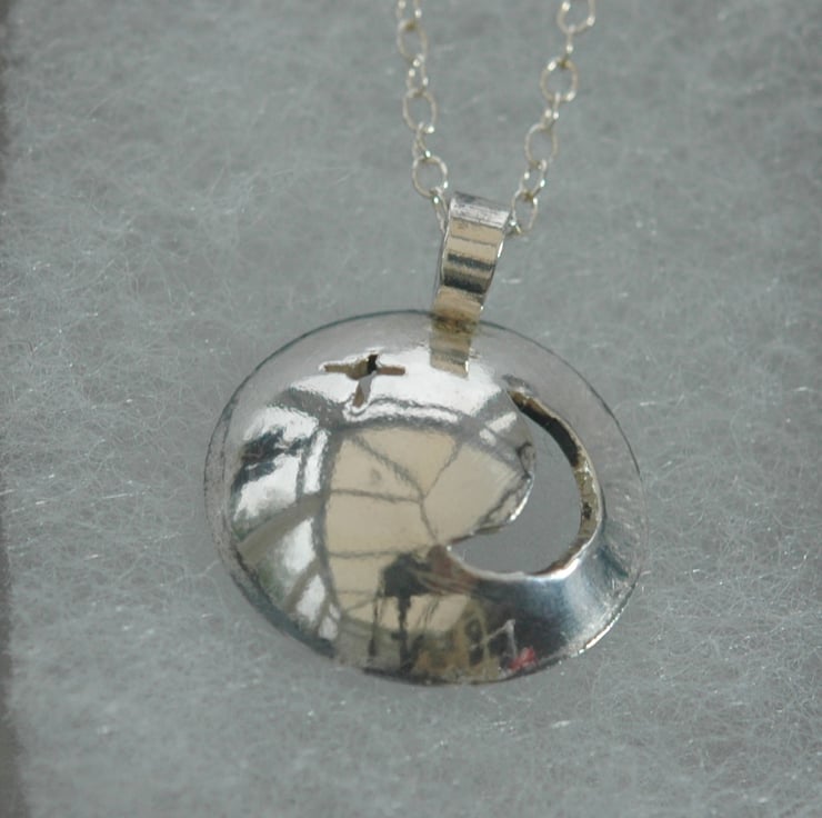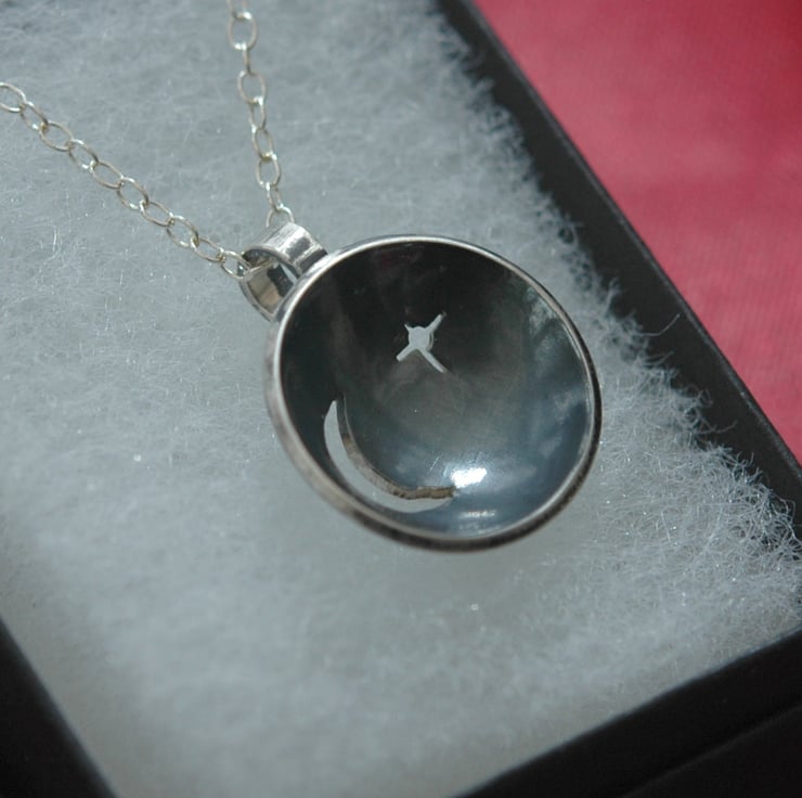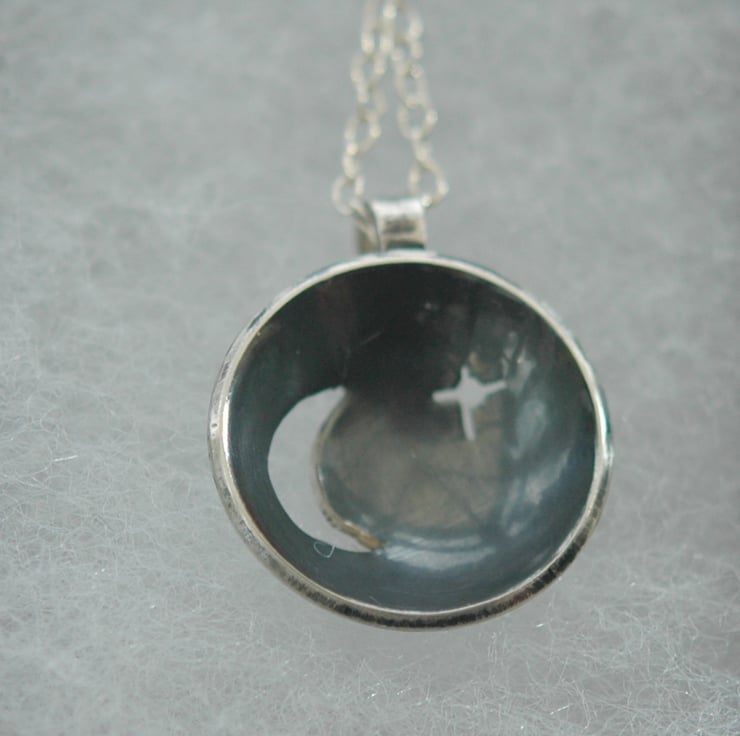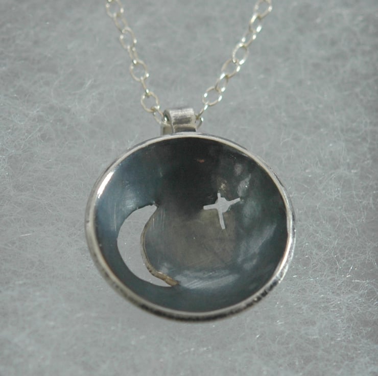 This unique pendant was hand-made from 1mm thick sterling silver sheet. I cut out the moon and star shapes with a piercing saw, then used a doming punch to make the disc concave. The inside was then oxidised to a dark grey colour while the back was polished to a high shine. The pendant can be worn with either side facing outwards so it is effectively two pendants in one!
