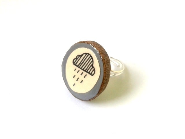 Contemporary ring made from a wooden circle, with a hand illustrated rain cloud weather scene, drawn on cream paper. The wood is painted grey. Sealed with layers of varnish and a protective enamel finish.
