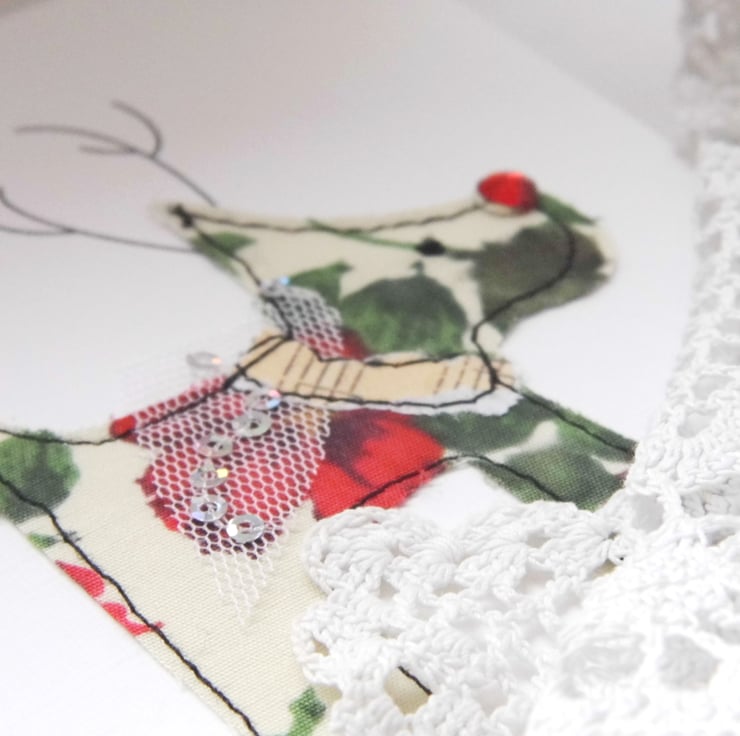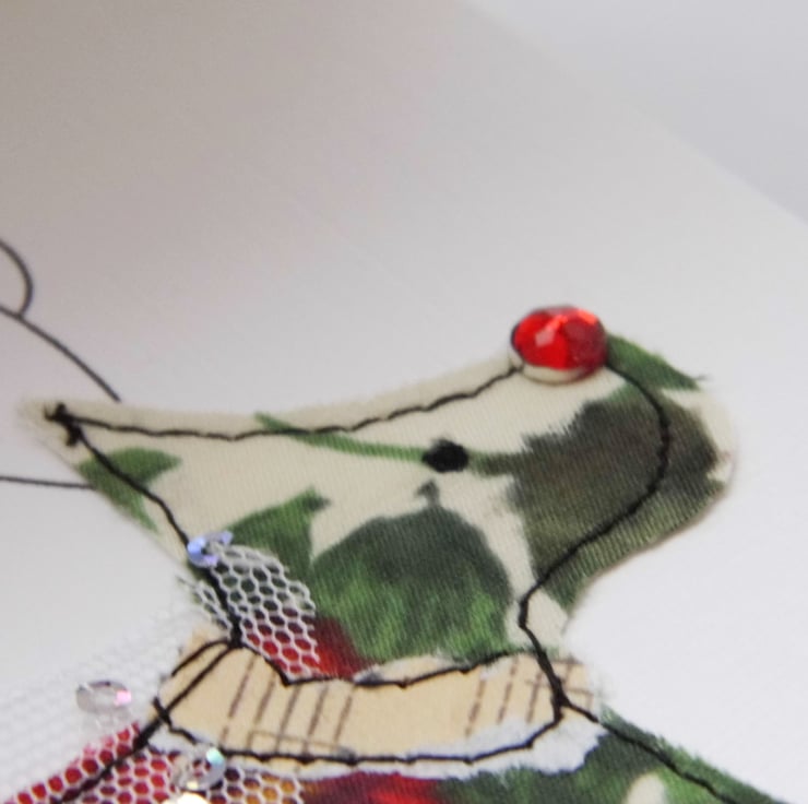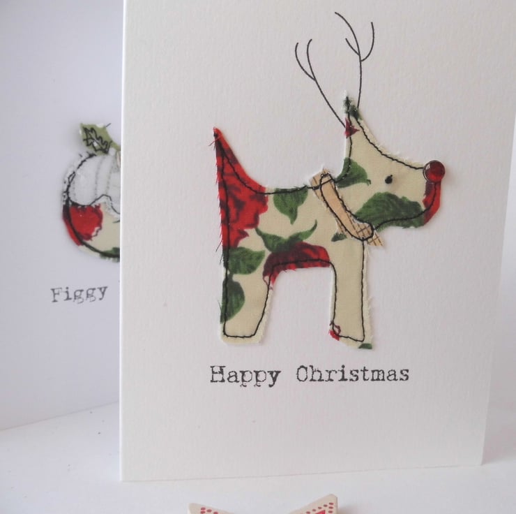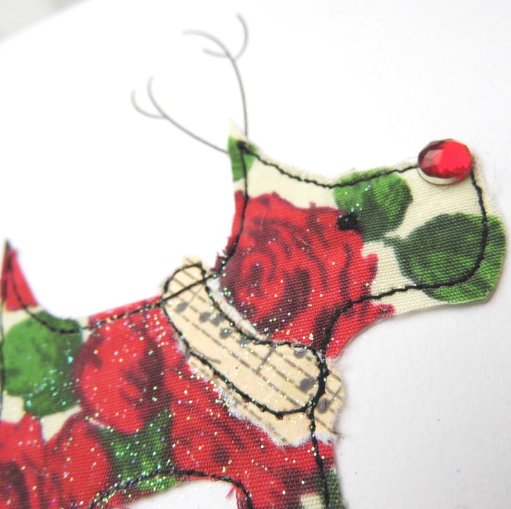 pretending to be Rudolf a cute dog made from liberty fabric with a shiny red nose a Christmas collar and antlers to wish you a Happy Christmas