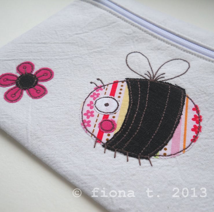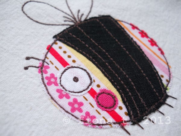 the BEE is in a pretty riley blake print cotton, with a black linen stripe on her back. her cheeks are flushed with excitement as she buzzes towards a pink cotton flower.