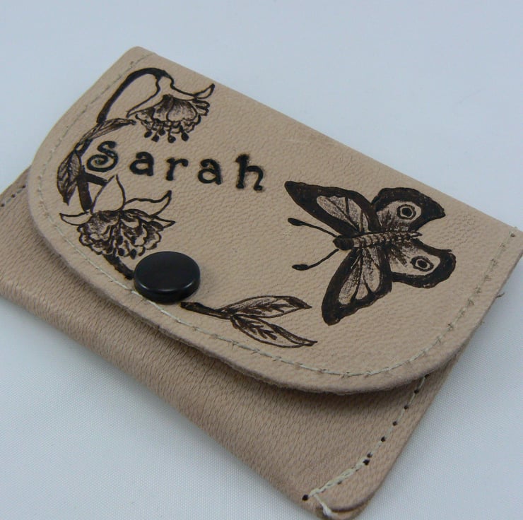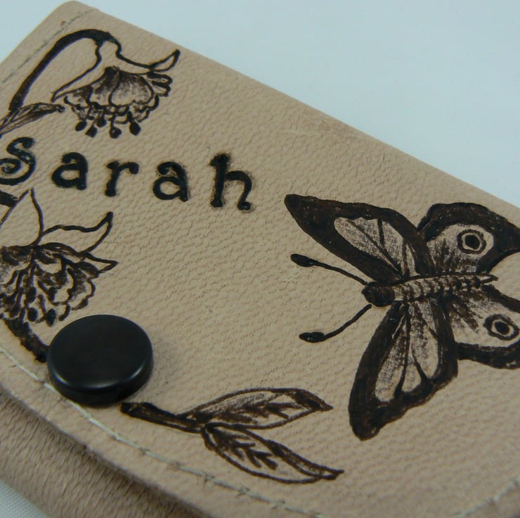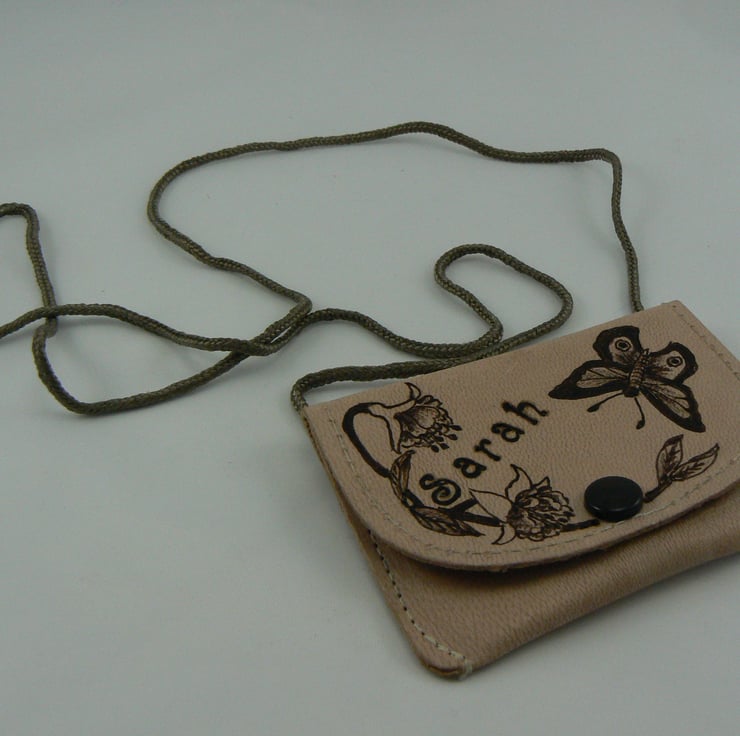 This little leather purse measures 4" x 2 1/2" and has a neck cord of 36" long, a handy purse to pop some coins and notes in, when you don't want to take a handbag somewhere. I have burnt the design on to this purse using a technique called pyrography