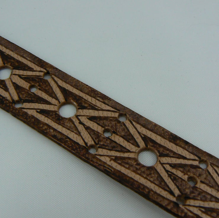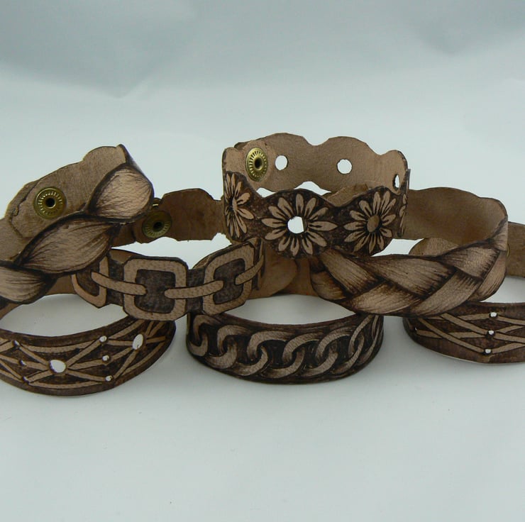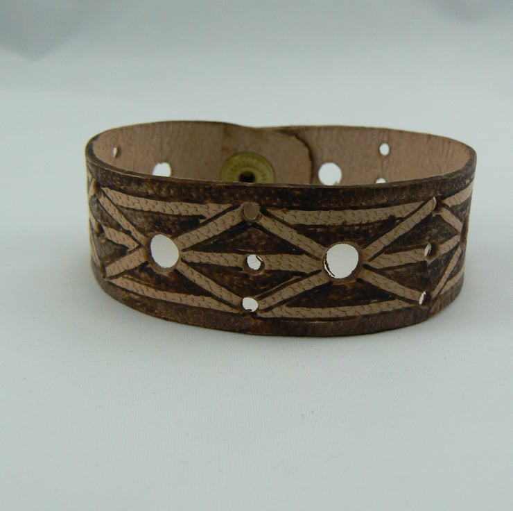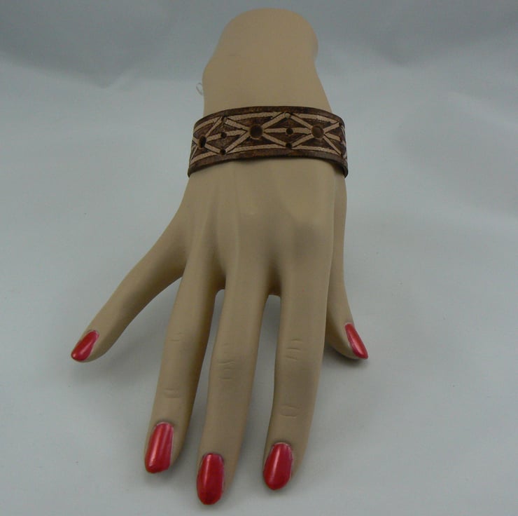This leather bracelet measures 7 1/2" when done up and is 3/4" wide and 2mm thick.