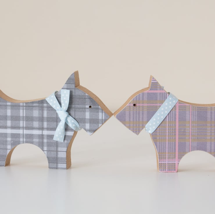 Scottie dogs made using reclaimed and recycled wood. Each is individually made and can either be painted or decorated using patterned paper. We have both in stock but please specify which you would like when ordering.