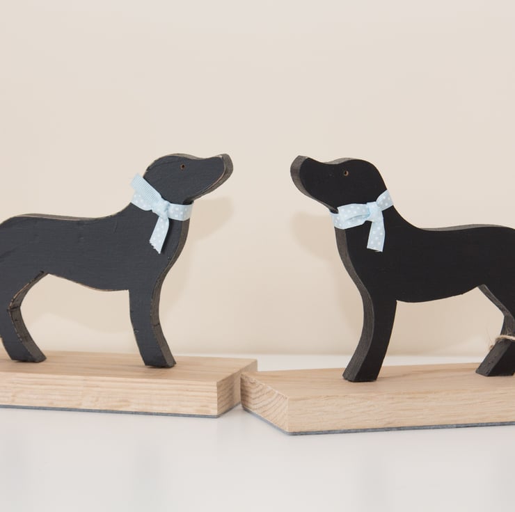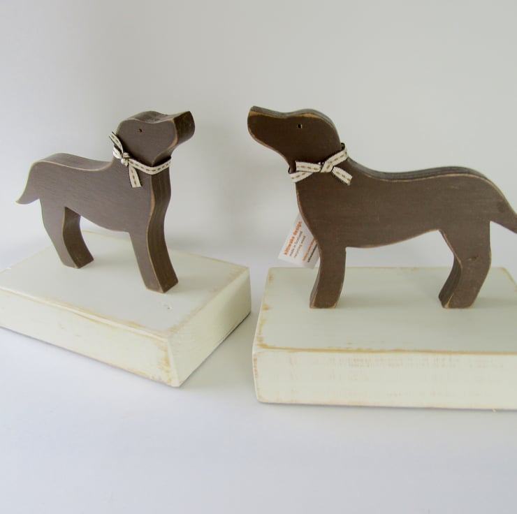 Hand made using reclaimed wood. Each piece is cut out using the band saw and painted, sanded and varnished. The Labradors can be painted black or chocolate or decorated with patterned paper if preferred. Do specify when ordering which you would like.