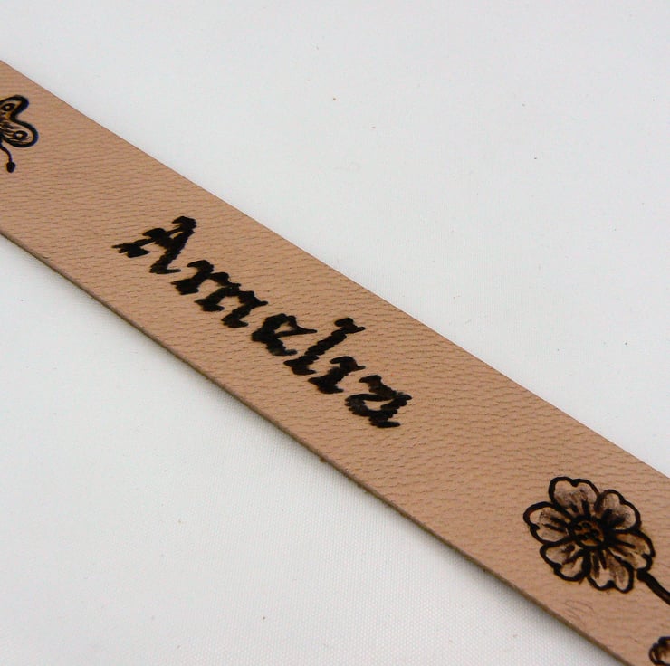 This leather bookmark measures 9" x 1" and has a butterfly and flower design burnt on it, I can personalise this one for you buy including a name of your choice.