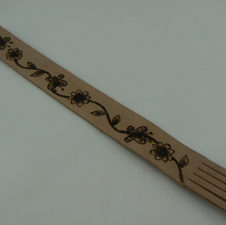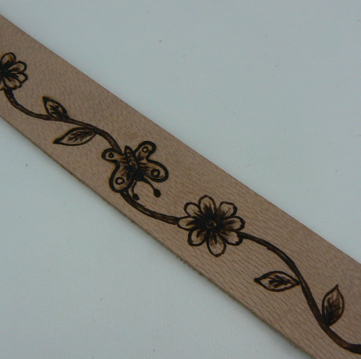This leather bookmark measures 9" x 1" and I have burnt the design onto the surface of the leather.