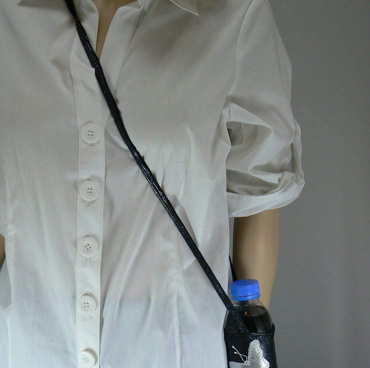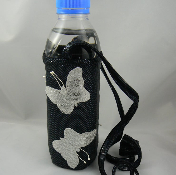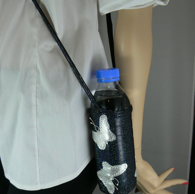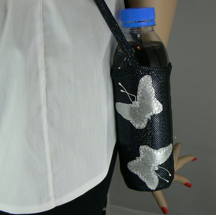 A drinking water bottle holder to take to the gym, dance class , zumba or a walk in the park, made of nylon lycra with cross body strap, leaving your hands free from having to hold.- decorated with silver butterflies on black holographic Lycra.