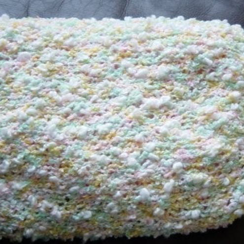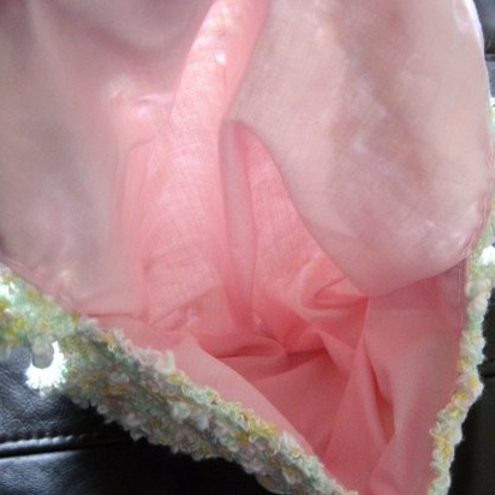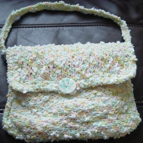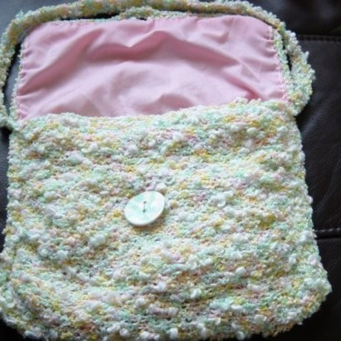 The yarn for this handbag is a multi-coloured bumpy pastel yarn, incorporating, pink, yellow, green and cream and is a mix of 56% cotton, 31% Acrylic and 13% polyester. The lining is 100% cotton.