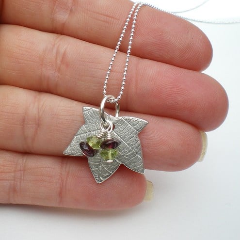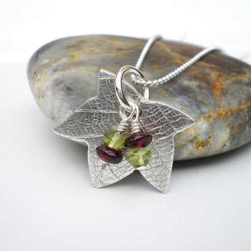 Sweet little hand crafted maple leaf pendant with a delicate sketetal leaf texture. Finished with peridot and garnet berries. Made from recycled silver making it a great eco friendly choice!