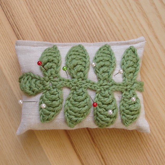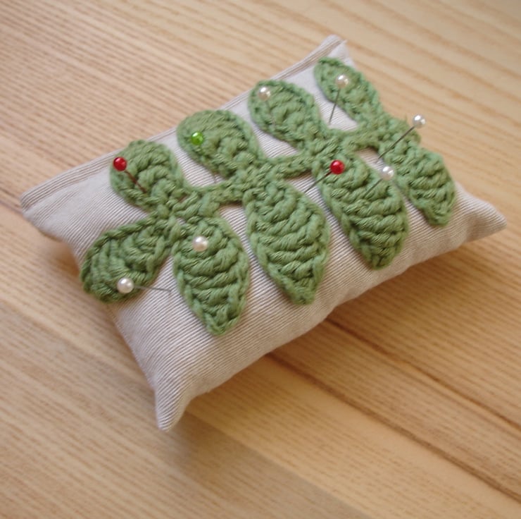 I'm branching out! This sweet crochet pin cushion is one of my newest creations having recently become hooked on crochet again. It is made using a sweet little leaf, crocheted in green cotton yarn which has been hand sewn onto a machine-sewn stuffed cotton cushion.