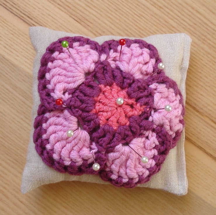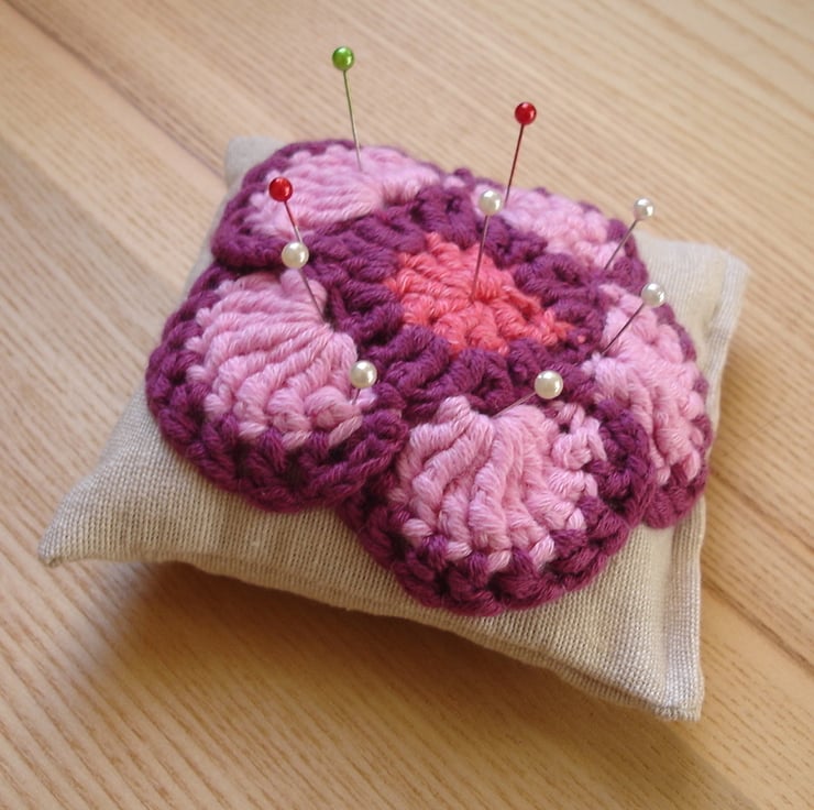 I'm branching out! This sweet crochet pin cushion is one of my newest creations having recently become hooked on crochet again. It is made using a sweet little flower, crocheted in purple and pink cotton yarns which has been hand sewn onto a machine-sewn stuffed cotton cushion.