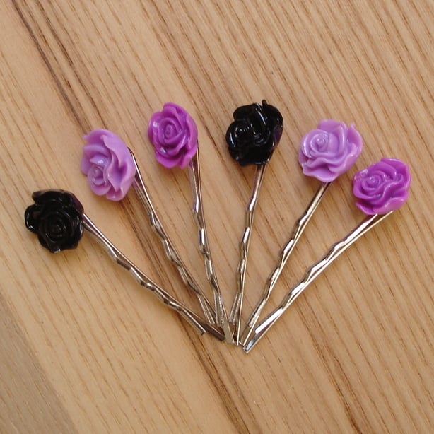 These cute hair slides feature acrylic roses, attached securely to metal bobbie pin type hair slides. Slides are 4.5cm long with the roses approx. 1cm in diameter.