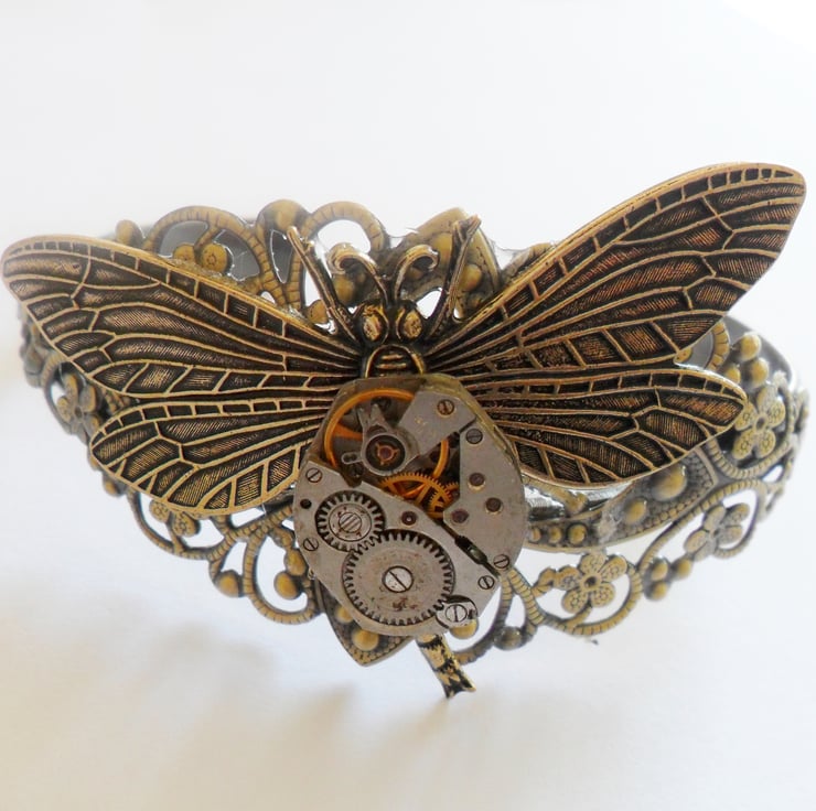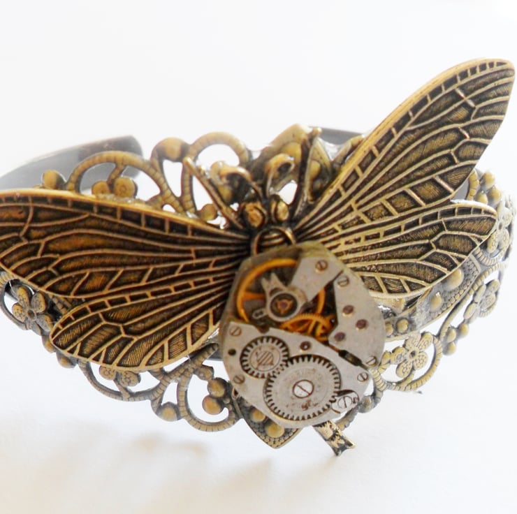 A delicate filigree antiqued bronze cuff has become the home of a butterfly in flight, adorned with a vintage watch movement. A conversation item of jewellery to wear on any occasion.