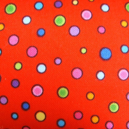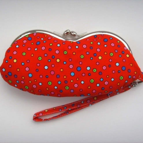Red spotty printed fabric, metal frame and clasp fastener, fully lined with a contrasting print, wristlet attachment with swivel clip.