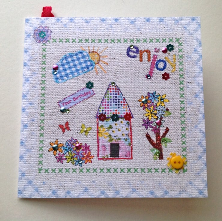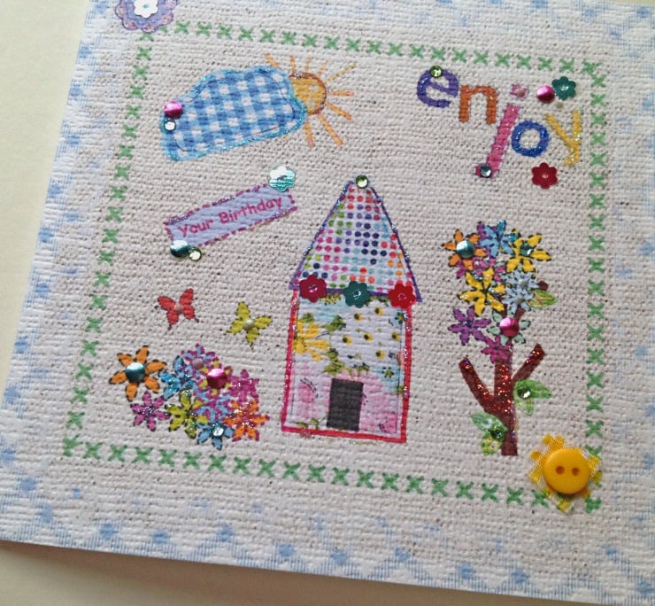Bright and Beautiful Coloured image of an applique work cozy cottage with flowers and butterflies