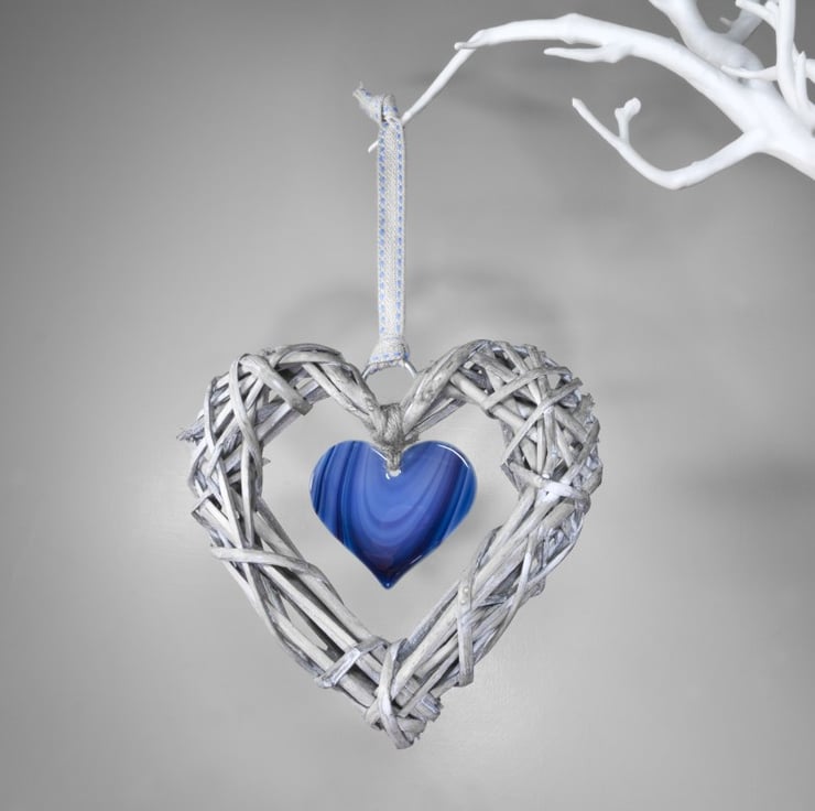 This natural wicker heart has a beautiful piece of blue art glass suspended in the middle and has been finished with a length of co-ordinating cotton ribbon.