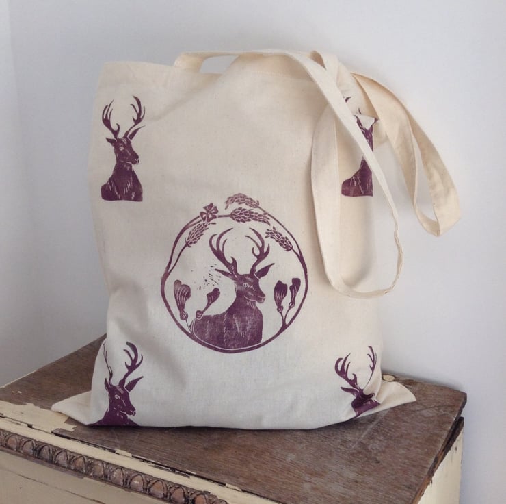 Beautiful hand printed cotton tote. A stag design printed in a muted purple colour using oil based inks and Lino printing.