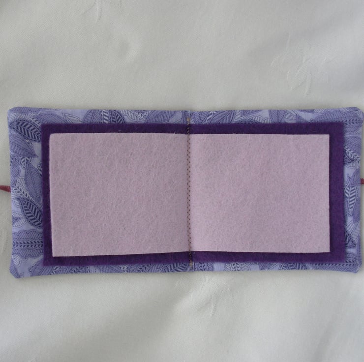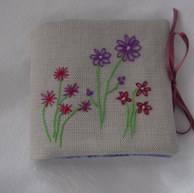 Handmade sewing needle case in a oatmeal linen outer fabric and alavender floral inner cotton fabric- 4ins (10cm) by 4ins (10cm) - with 4 felt leaves in lilac and purple for your needles and pins - decorated on the front with red and purple embroidery flowers and green embroidery stems - does up with a dar red ribbon tie - all hand cut and sewn to my own design.