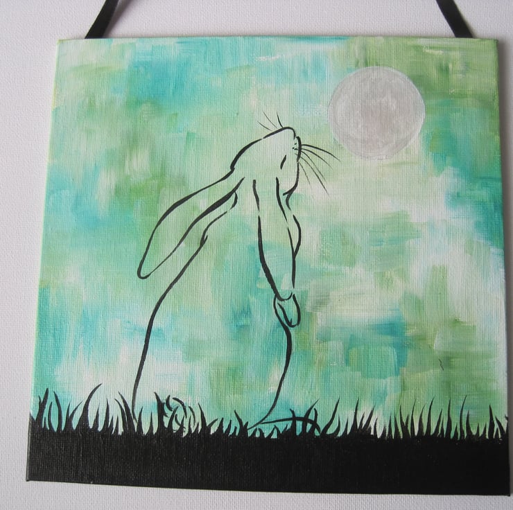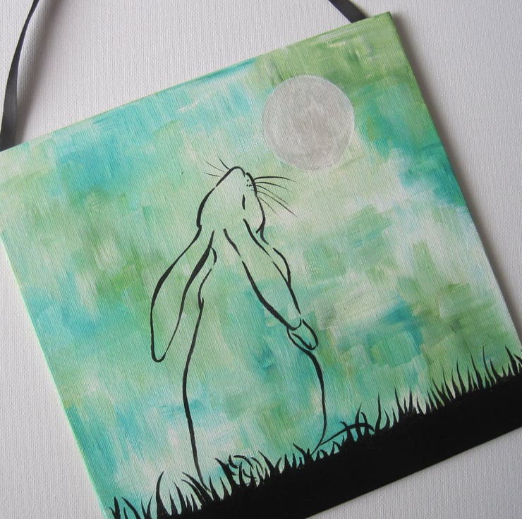 An original acrylic line painting of a little bunny against a sky in shades of green with an iridescent full moon.
