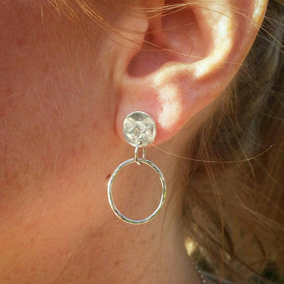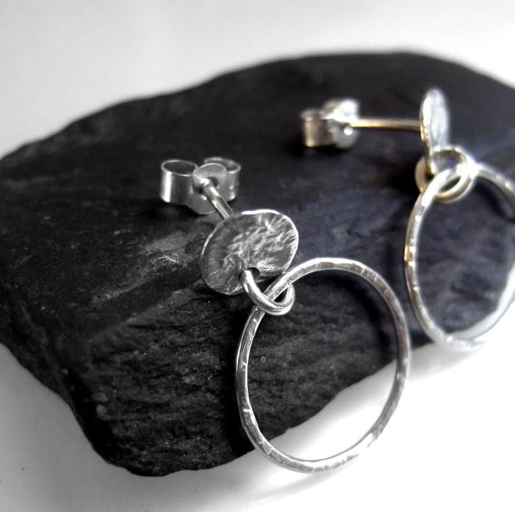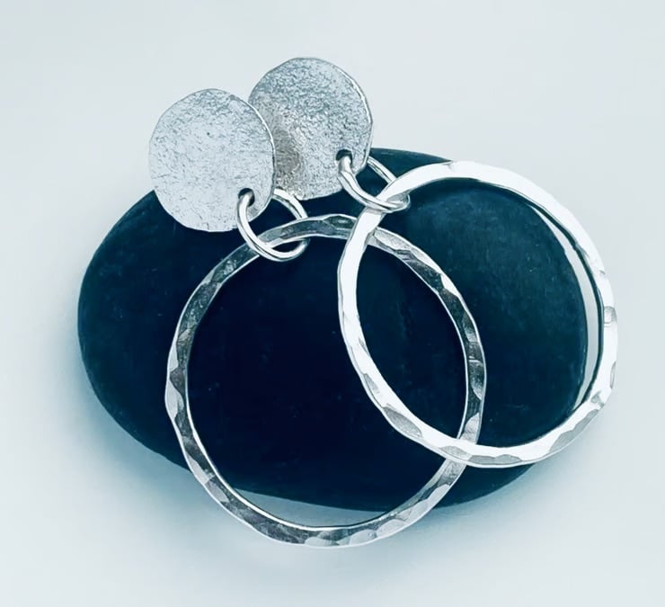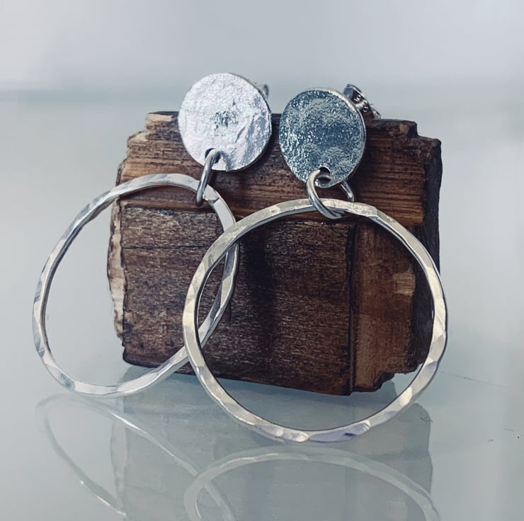 Fire textured studs approx. 9 mm pierced out and then textured, fire texture, heating the metal until bubbling and distorting the metal, this gives a unique and slightly mis shaped design. The hoops are made with 1.2 mm sterling silver wire with a hammered dimple texture. 22 mm diameter Not too small and not too heavy, the dimpled texture will catch the light and catch the eye.