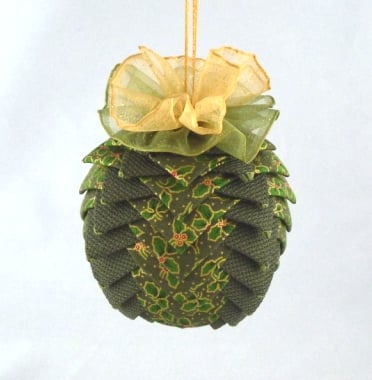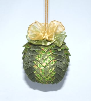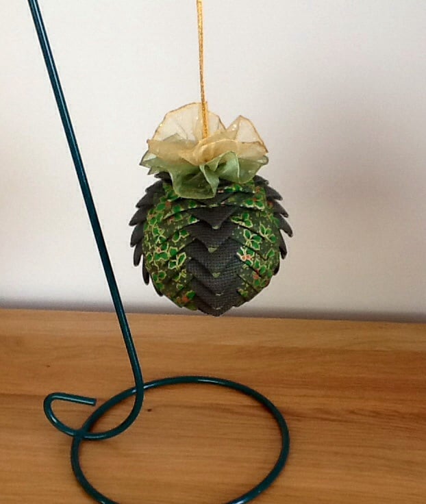 This lovely handmade Christmas Decoration will make a perfect gift for someone or to just hang on your Christmas Tree or in any room during the festive season. Its made from Olive Green Hessian ribbon and festive fabric. Its made with a 8cm Polystyrene Ball and small sequin pins. The top is tastefully decorated with a Green and Gold Organza ribbon. I've also added a finer Gold Lame ribbon to hang it with.