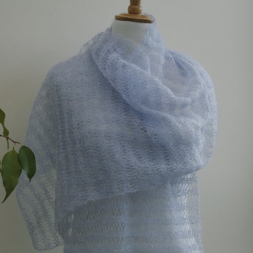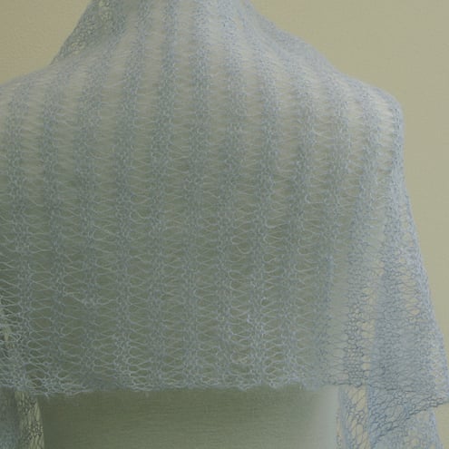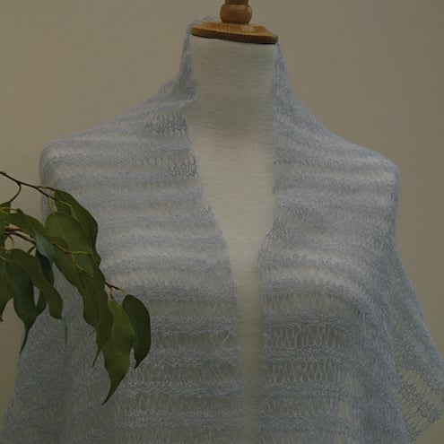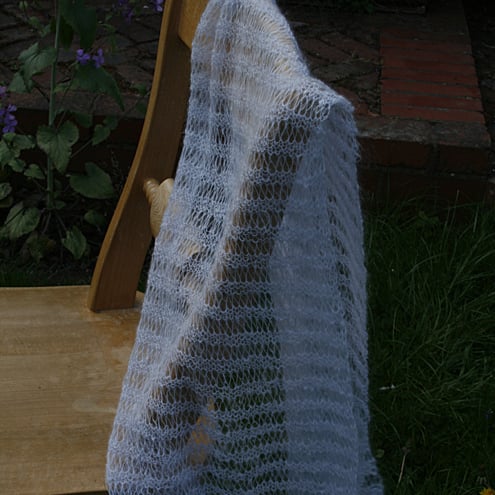 Hand-knitted in a fine mohair mix yarn, in a simple lace pattern, the stole drapes beautifully.