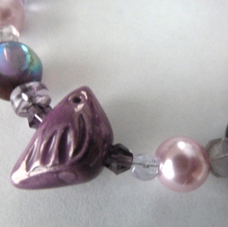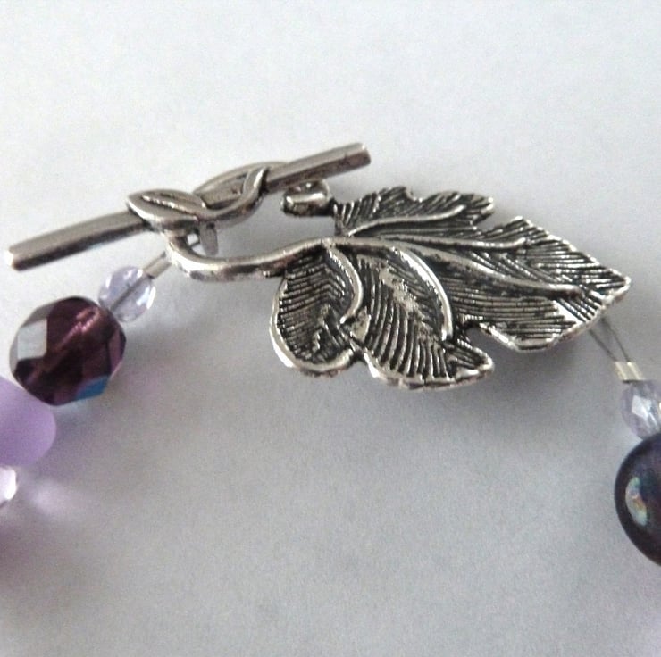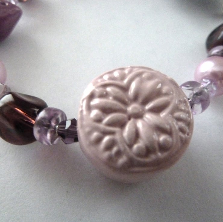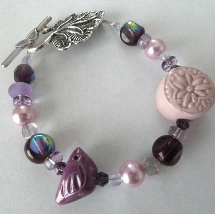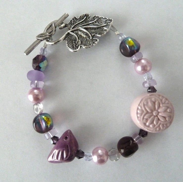 A bracelet which has been made using a handmade ceramic bird bead and a handmade ceramic pink circle bead, it also features pink and purple glass beads and fastens with a antique silver leaf toggle.