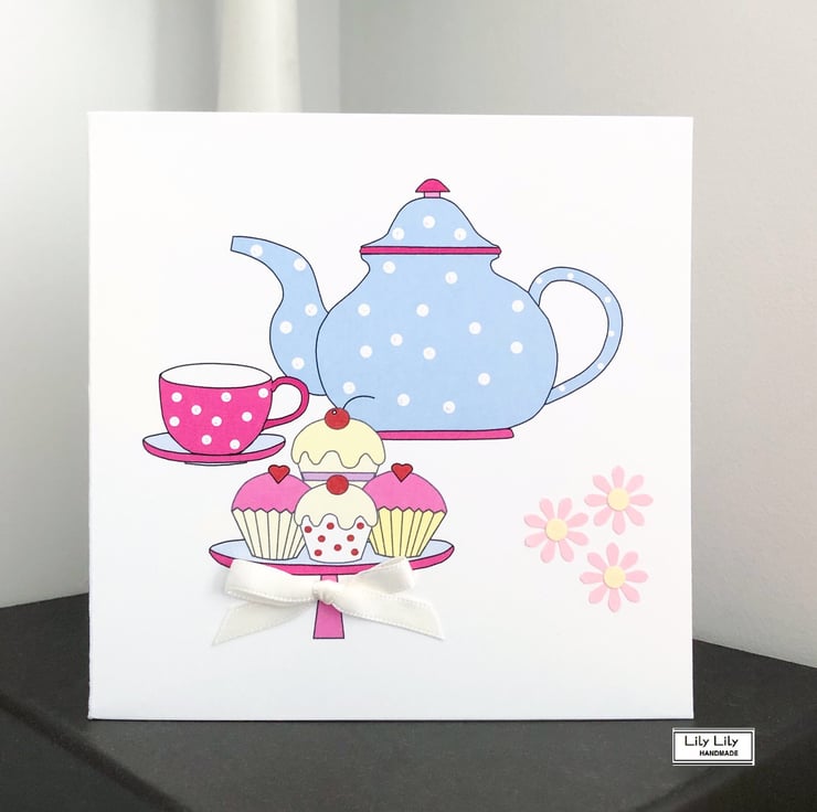 A handmade blank card featuring an afternoon tea design by Lily Lily Handmade. Highlighted with glitter and embellished with a satin ribbon bow.