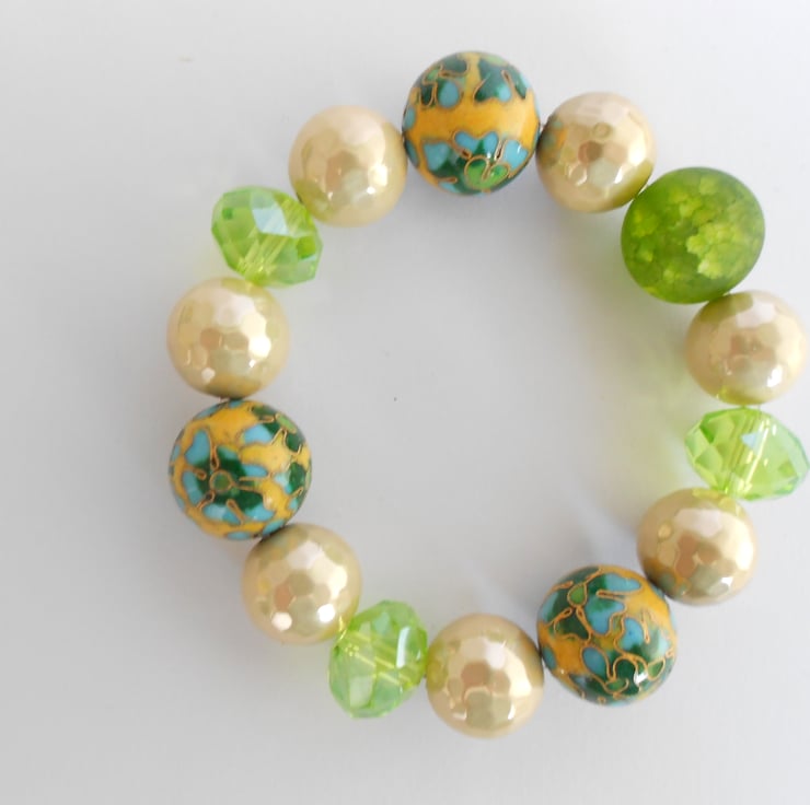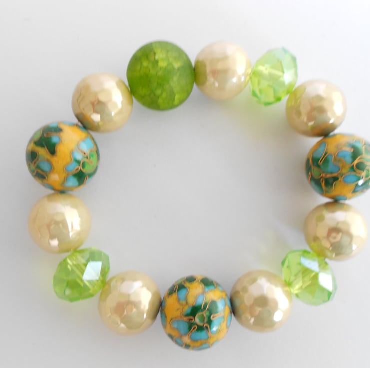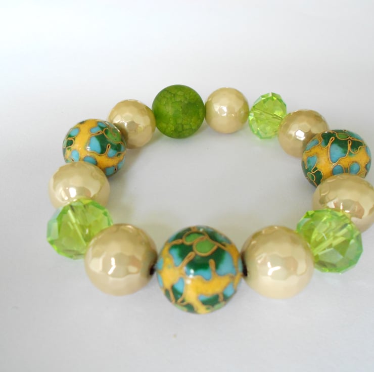 This is a lovely stretchy bracelet comprising of one cracked agate focal bead three cloisonne beads and three crystals, there are also seven antique gold coloured resin beads. The colours are lovely and autumnal. This is a chunky bracelet with beads ranging from 15mm to 12mm. This is a one off piece so this is the bracelet you will receive. It will arrive gift wrapped in tissue paper and a organza bag.