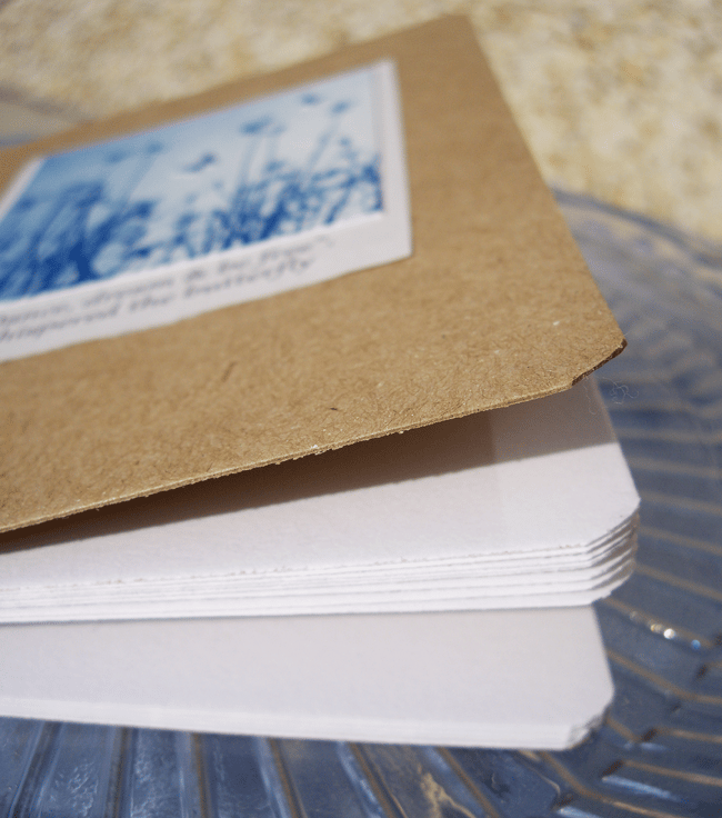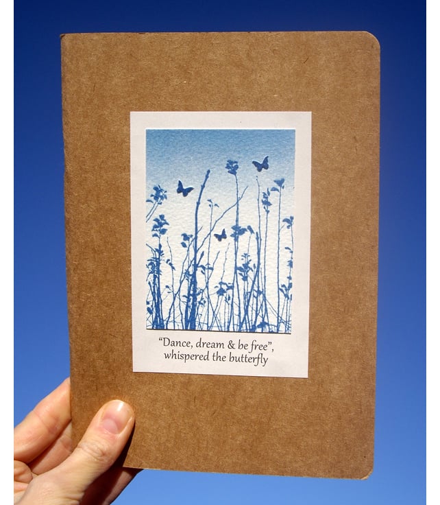 A notebook to make your heart sing and inspire your soul. Tiny butterflies flutter around a meadow cyanotype with the charming expression Dance, dream & be free, whispered the butterfly.