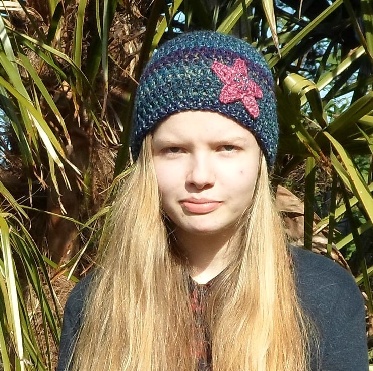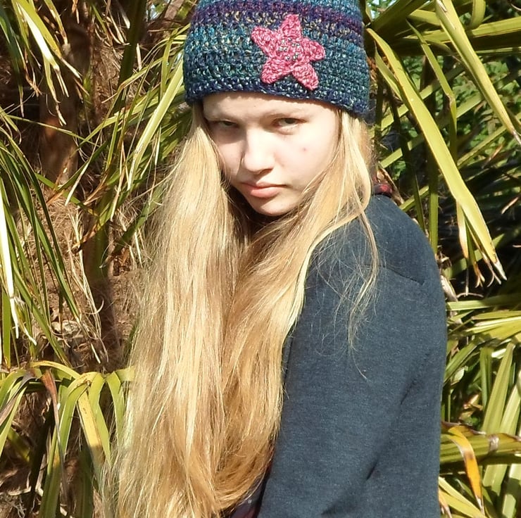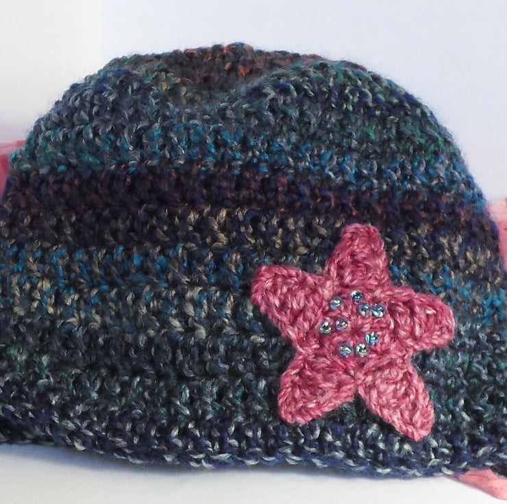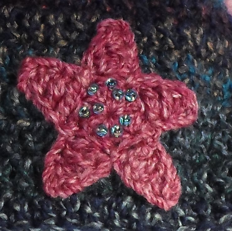 A crochet star in dark pink sets off the darker colours. The star is decorated with variegated blue glass beads.